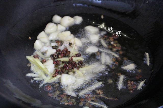8,油鍋燒熱,下姜蒜,花椒粒炒出香味。