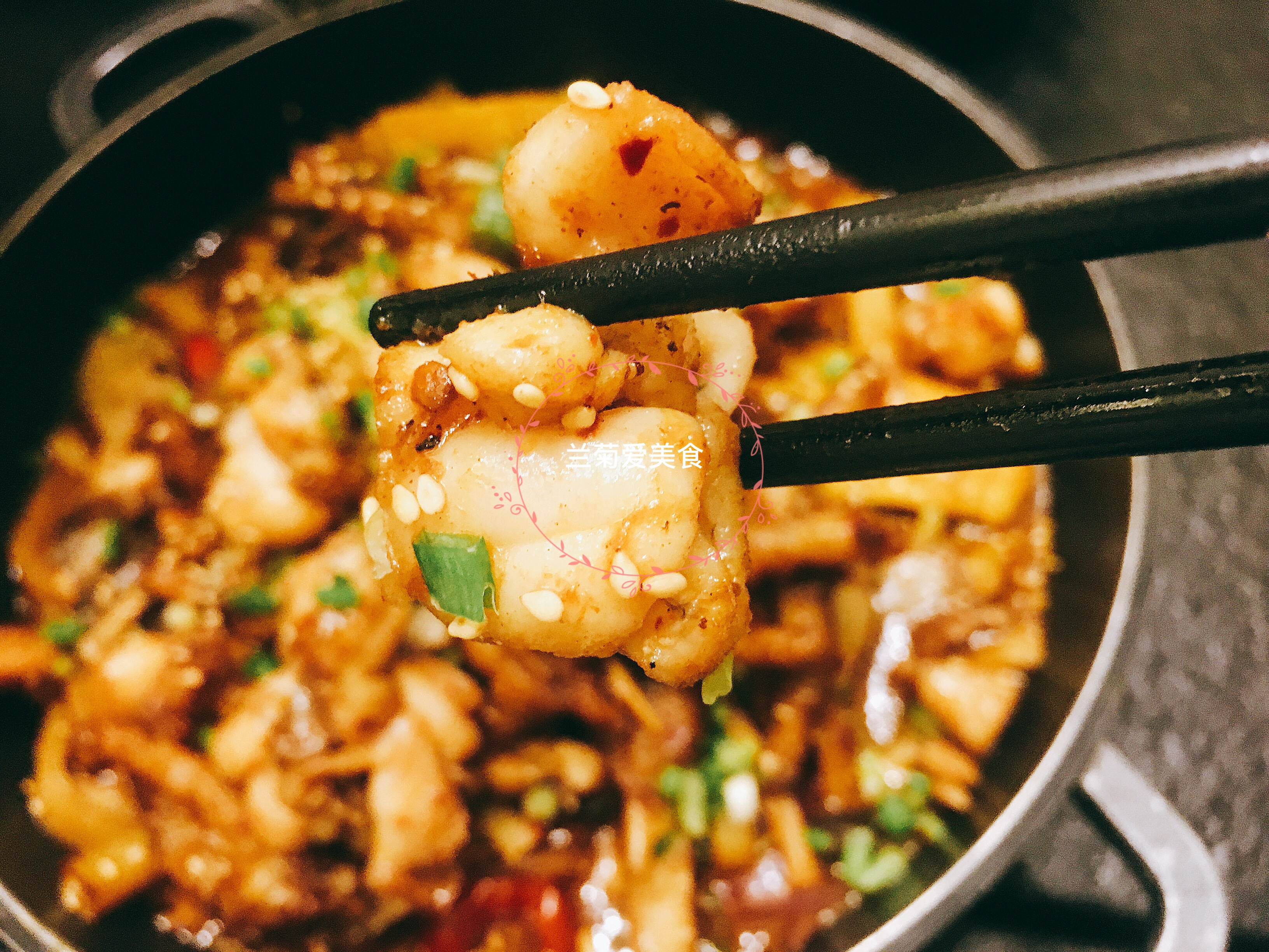第五和第六道菜,干鍋牛蛙煲與干鍋明蝦煲。這個店的一貫風(fēng)格應(yīng)該是量大,這兩個煲的分量都不小,吃起來還真讓人小有壓力。從味道上說,這兩款的醬汁比較接近,但是比前面的肉蟹煲和豬手煲味道要更重一點。吃法也有點不太一樣,肉蟹煲如果要加配菜就只能在點菜的時候提出,后廚一并做好端上來;但是干鍋要更自由一點,等上面的食材吃到差不多了,可以點上火再加熱,繼續(xù)加菜往里面涮著吃,一下解決了又想吃干鍋,又想吃火鍋的問題。