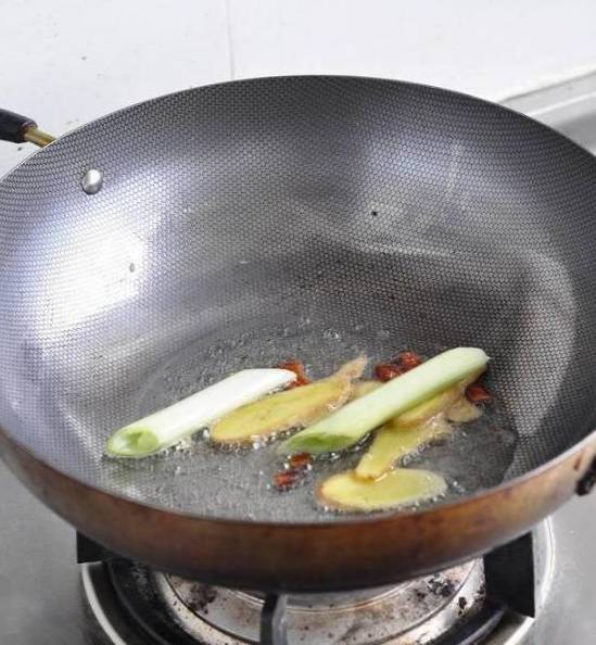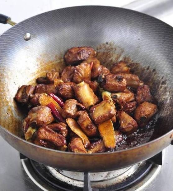 倒入排骨炒到微黃。放入干辣椒,繼續(xù)煸炒排骨邊緣焦黃