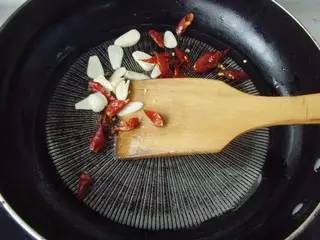 4、放入花椒粒爆香,再放入蒜片、干辣椒。