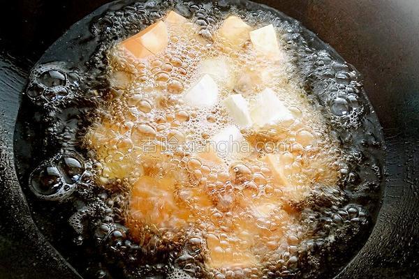 4.油溫五成熱時(shí),把切好的紅薯塊倒入鍋內(nèi)炸制。紅薯下鍋后,改調(diào)小火繼續(xù)炸制。(油溫的判斷;用一根筷子放入油鍋,筷子周圍起小泡即可)