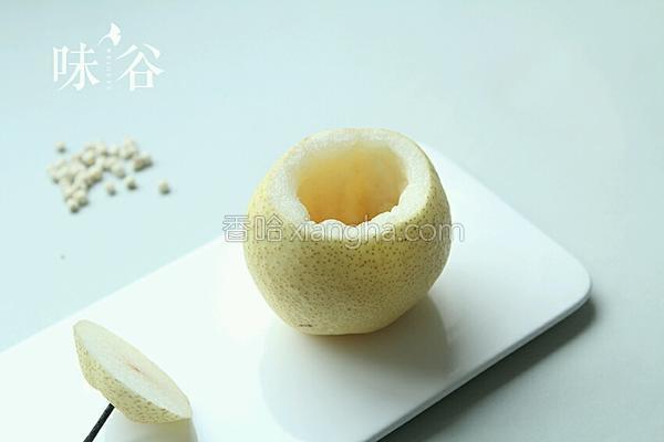 2.雪梨洗干凈,切去上面四分之一處 用湯匙把雪梨心挖掉,小心別挖穿底部。