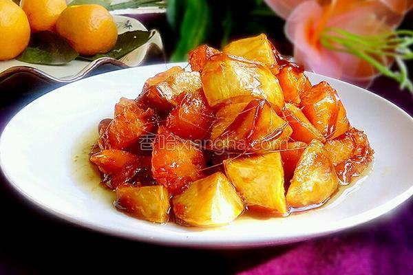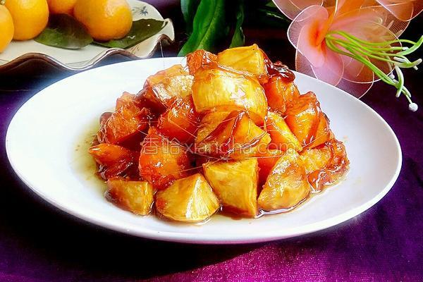菜譜小貼士: 熬制糖漿時(shí),一定小火慢熬,讓白糖慢慢的溶化,如火大,糖漿就很容易糊。油燒五成熱下紅薯塊炸制,紅薯塊下鍋,馬上改小火炸,這樣才能把紅薯炸透。如炸紅薯的火大,很容易造成紅薯的表皮焦了,而里面還是生的。