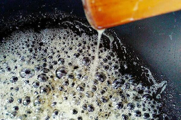 8.待鍋內(nèi)糖漿熬制的少許變色時(shí),迅速關(guān)火,不然糖漿就熬過了