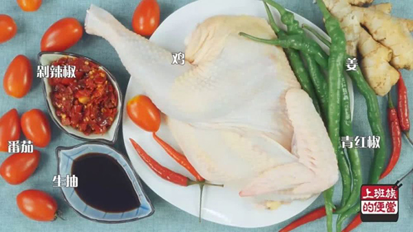 然后繼續(xù)翻炒幾下,把雞肉推至一邊,放入20g剁辣椒,小火炒出紅油,混合炒勻讓雞肉吸收辣椒的香味,接著放入小番茄,淋入2勺生抽,把食材混合炒勻。