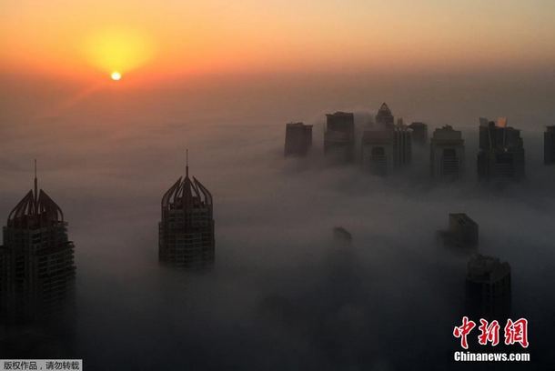 當(dāng)?shù)貢r(shí)間12月5日,阿聯(lián)酋迪拜遭遇晨霧,高樓大廈被大霧籠罩如入云端。