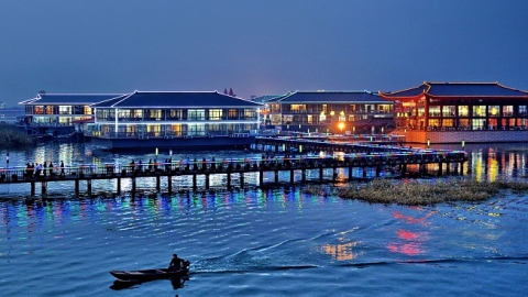 “長蕩湖水街”位于美麗的長蕩湖畔,由50多條餐飲船集中歸并經(jīng)營,2000多米曲折有致的棧橋?qū)⑴c3個(gè)區(qū)域所有船只連為一體,棧橋兩側(cè)種植蘆葦、睡蓮和菱藕等水生觀賞植物。信步走上棧橋,近可觀賞個(gè)性化差別化裝修后自成一景的紅、黃、藍(lán)船只,遠(yuǎn)可眺望水天茫茫,也能乘著古樸的畫舫船,一路上可以看到一只只大閘蟹懶洋洋的吊在圍網(wǎng)上曬太陽,伸手就能摘得。夜晚,棧道兩旁的LED照明燈七彩閃爍,別有一番風(fēng)味。