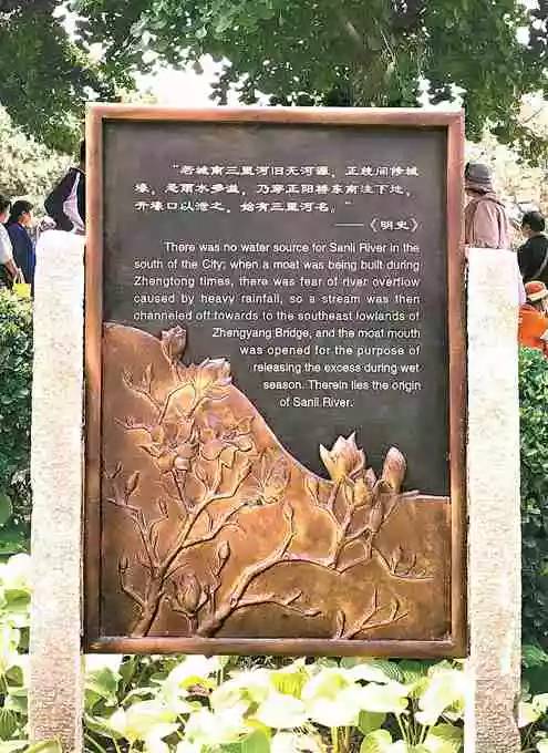 入口處有個(gè)銅牌,講述著三里河的歷史。明史記載:吾城南三里河舊無(wú)河源,正統(tǒng)間修城壕,恐雨水多溢,乃穿正陽(yáng)橋東南洼下地,開(kāi)壕口以泄之,始有三里河名。