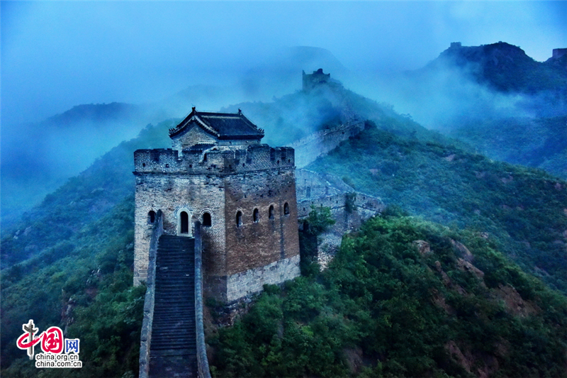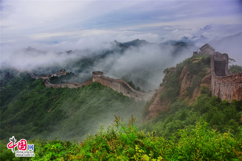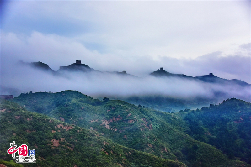 忽爾又一陣雨來,云霧頃刻飛飄入山谷,延綿長城若隱若現(xiàn),像是一條巨龍?jiān)谠坪V酗w騰,那一刻,唯有感謝大自然的恩賜了。