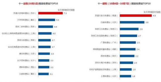 出返程易擁堵收費站中,10月1日為高速出程高峰,蘇州蘇通大橋南收費站擁堵程度最高,其次為重慶沙坪壩收費站;10月6日至7日返程車流較分散,收費站周邊擁堵程度普遍要低于10月1日,其中最擁堵的收費站為南通的蘇通大橋北收費站。