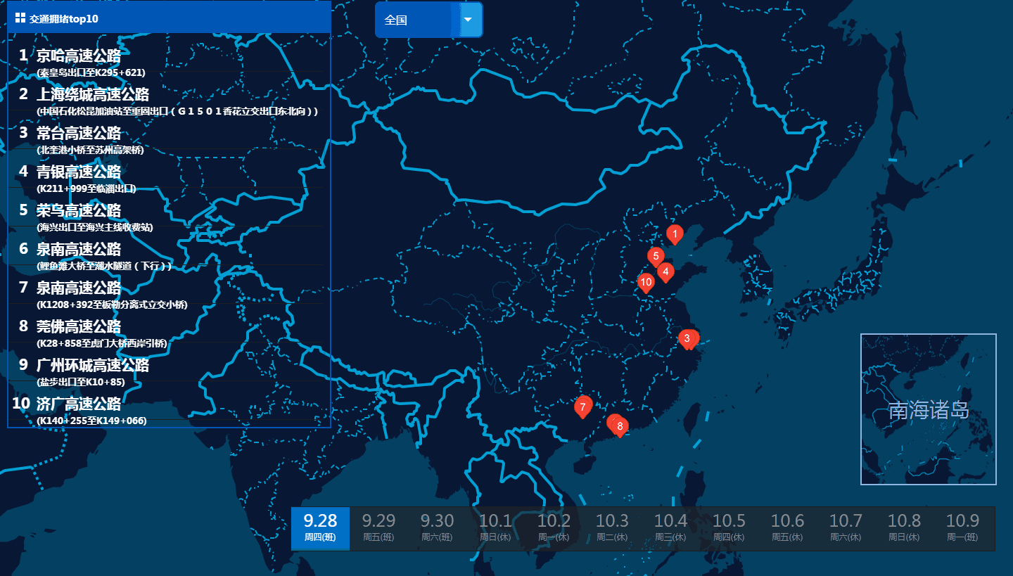 而9月28日至10月9日期間預測的十大擁堵路段中,10月1日的是沈海高速寶安收費站砸道橋至南通(南)出口、滬蓉高速蘇家灣中橋至棗莊服務區(qū)-加油站、京滬高速璜塘出口至顧周中溝橋、廣昆高速蓮塘出口至K106+538、滬渝高速K166+068至梨花橋(右橋)、長深高速K1819+022至熱水互通B砸道橋、長深高速羊田小橋2至K3529+315、沈海高速埔仔一橋至陸豐高速南加油站、寧洛高速十八河至中橋3右幅、京港澳高速元貝大橋至K2109+465。