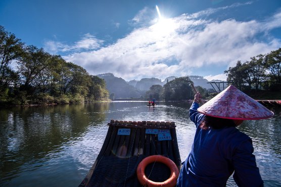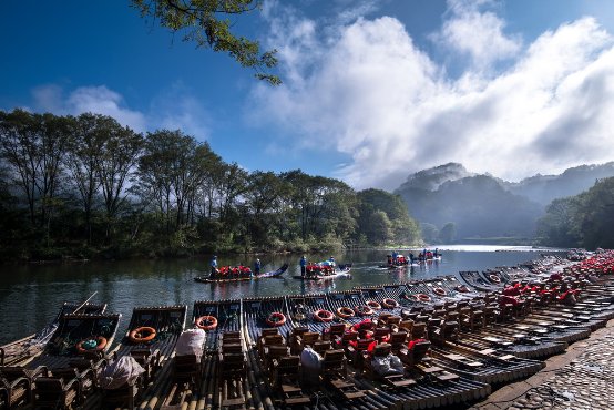 每天清晨,可以看到竹筏碼頭密密麻麻停滿了待開的竹筏。數(shù)百名船夫陸續(xù)到崗,換上衣服鞋子,擺放好竹筏上的竹椅,坐在岸邊靜待開工。