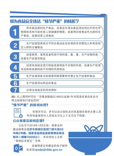 草案比現(xiàn)行條例增加了136條,達到200條。值得一提的是,草案明確了食品安全違法“情節(jié)嚴(yán)重”的具體情形(見制圖),此類行為可行政拘留。