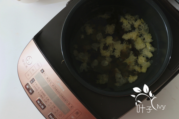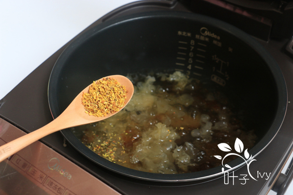 4.選擇電飯煲“煲湯”功能,按下開始按鍵。燉煮至粘稠軟爛,加入冰糖、桂花,關(guān)蓋燜至冰糖融化即可。