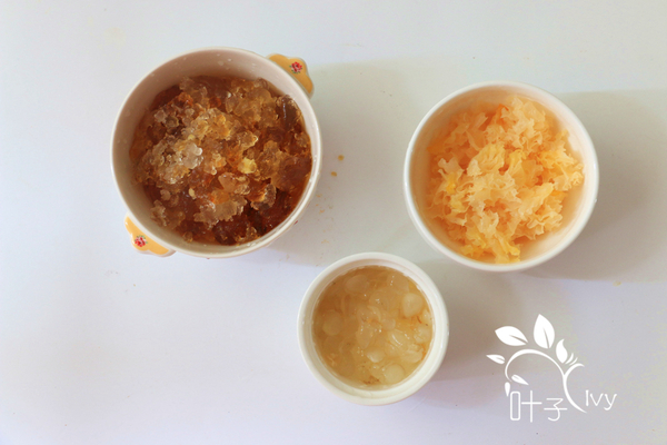 2.銀耳提前浸泡2小時,浸泡好的銀耳去根撕下塊,桃膠、皂角米去雜質(zhì)。