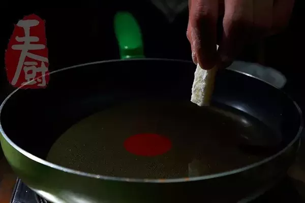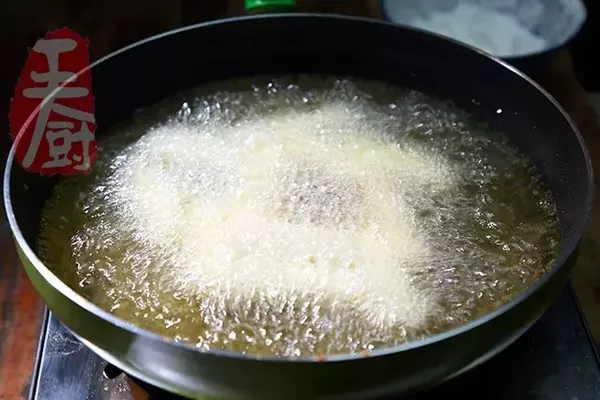 9、大火炸至金黃色撈出盛盤備用。