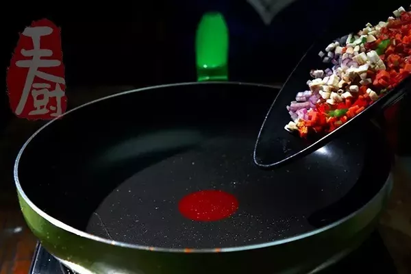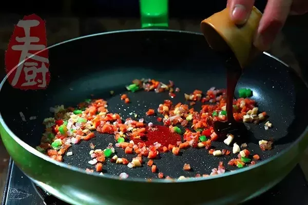 10、鍋內(nèi)留少許油,放入臘腸丁、香菇丁、火腿丁、青紅椒丁、香菇丁、洋蔥丁炒香。