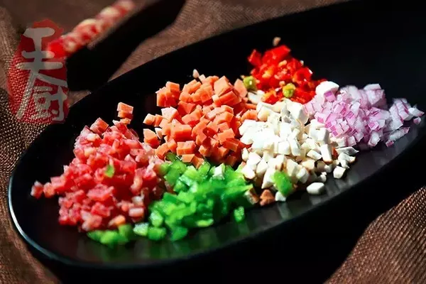 6、火腿切成小丁,香菇切成小丁,洋蔥切成小丁,紅椒切成小丁放入盤中備用。