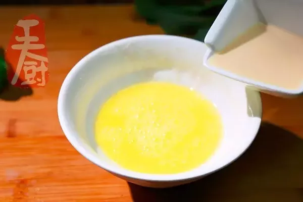 2、把雞蛋打開放入碗里,倒入豆?jié){,用筷子攪拌均勻。