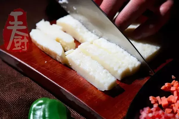 7、蒸熟的雞蛋取出,呈豆腐模樣,切成長條。