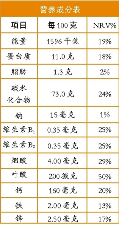 以下面某品牌營養(yǎng)強化小麥粉為例,其配料表為:小麥、碳酸鈣、煙酸、氧化鋅、乙二胺四乙酸鐵鈉、維生素B1、維生素B2、葉酸。上述除小麥以外的其他物質(zhì),均為食品營養(yǎng)強化劑,分別可以增加小麥粉中鈣、煙酸、鋅、鐵等營養(yǎng)素的含量。按照我國標簽標準要求,添加了營養(yǎng)強化劑的小麥粉在營養(yǎng)成分表中,除了要標注能量和蛋白質(zhì)、脂肪、碳水化合物、鈉4個核心營養(yǎng)素外,還需要標注強化以后營養(yǎng)素在產(chǎn)品中的含量。因此,大家在選購時只需看營養(yǎng)成分表即可。