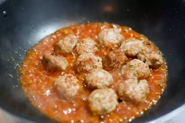 6、然后把肉丸倒入煮沸的酸甜醬中,中火煮約2分鐘,讓肉丸均勻上色、醬汁入味。