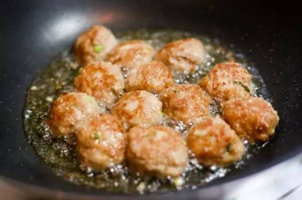 4、中火熱鍋,倒入食用油,油熱后,放入肉丸, 煎至兩面金黃,將肉丸和剩下的油裝入一個(gè)盤(pán)中,待用。
