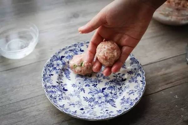 3、將攪拌后的肉碎在兩掌之間揉成球狀、成型后放入碟子中。
