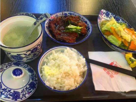 一份套餐完全可以把小姑娘吃得噔牢,蔥烤大排酥嫩的可以用筷子夾開來一塊塊吃,肥瘦正好!套餐還配有一份湯和一份蔬菜,中午吃一份這樣葷素搭配均勻的套餐,真的是舒舒服服~