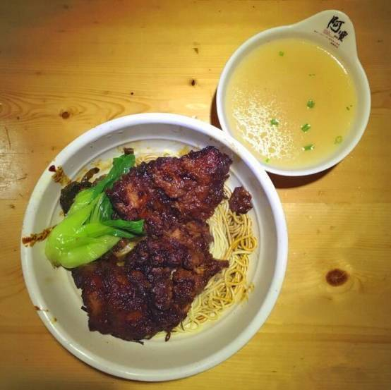 阿寶面館的蔥烤大排真的是大·排,活生生把面都擋住,只能看到大排。燒的近乎發(fā)黑,足以見得這個(gè)味道該有多濃郁。放在面上當(dāng)澆頭,老板也是夠大方!這一碗吃下肚里,不知道該有多滿足喲~