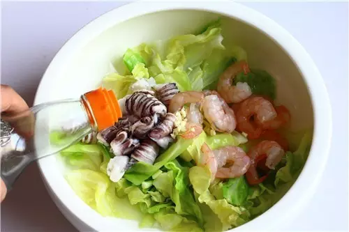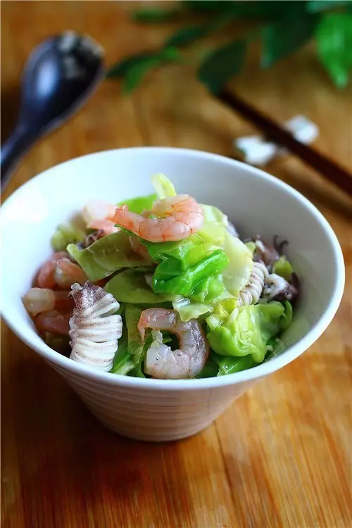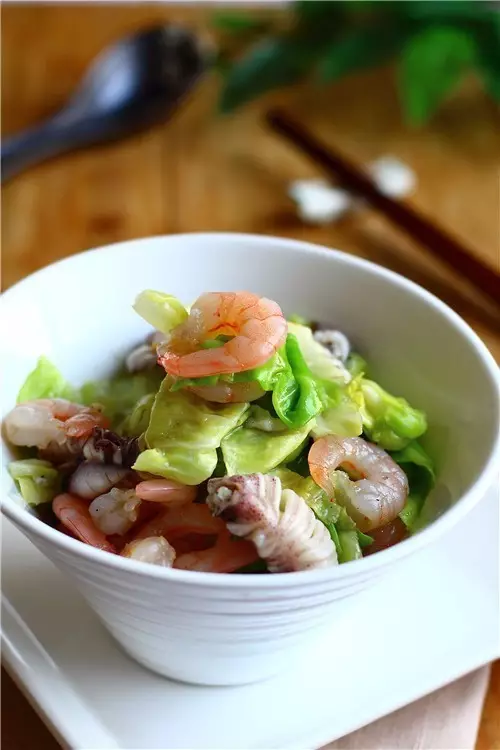 蝦仁Q嫩,筆管魚脆爽有嚼勁,圓白菜微甜清新,這樣的搭配,會是你的菜嗎?