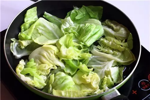 2、湯鍋加水燒開,放入撕好的圓白菜,用開水燙一下,然后用涼水投涼干水分備用。