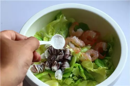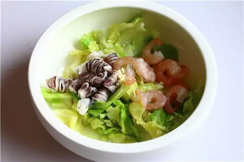 5、取一個湯碗,放入備用的圓白菜、筆管魚和鮮蝦仁。