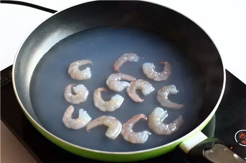 4、撈出來筆管魚的水,再放入鮮蝦仁燙熟撈出來,用涼水投涼備用。