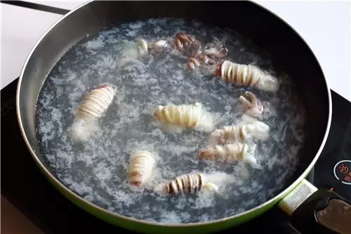 3、湯鍋加水燒開,放入切好的筆管魚,焯燙一下?lián)瞥鰜碛脹鏊稕鰝溆谩?/span>