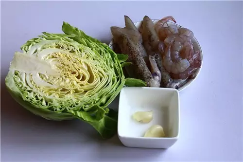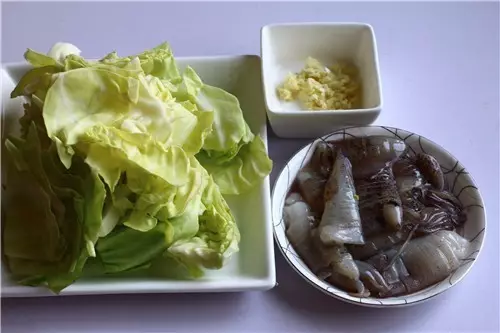 圓白菜200克 鮮蝦仁30克 筆管魚30克 去皮大蒜2。