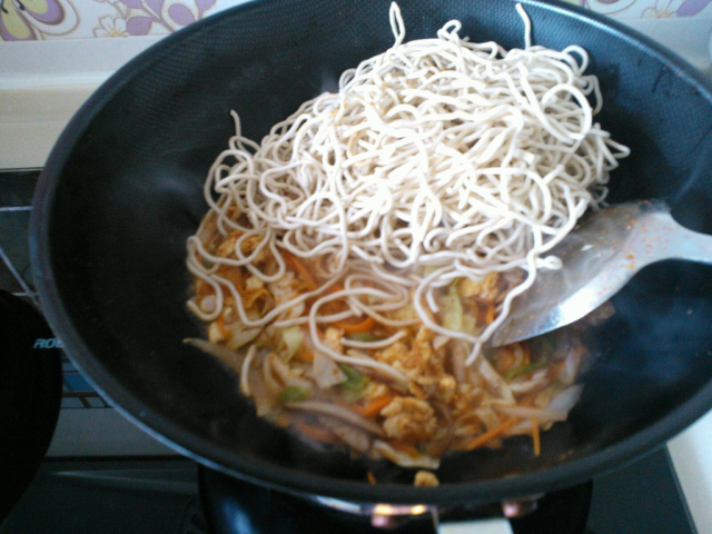 2. 最好購(gòu)買蒸好的炒面,稍微軟點(diǎn)的;如果買的是硬的,回家自己煮一下,再過(guò)個(gè)冷水,瀝干水備用。
