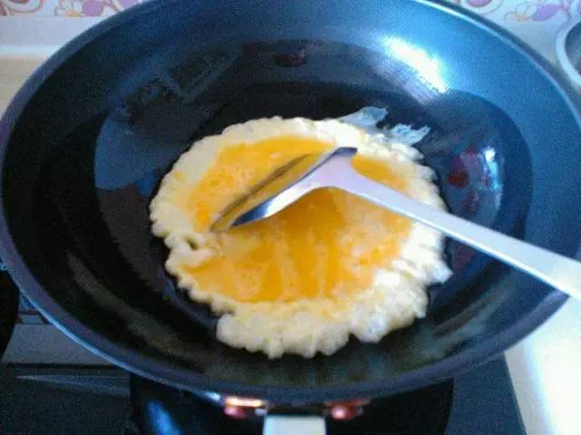 4.鍋燒熱加入食用油,把雞蛋液放入煎至金黃。