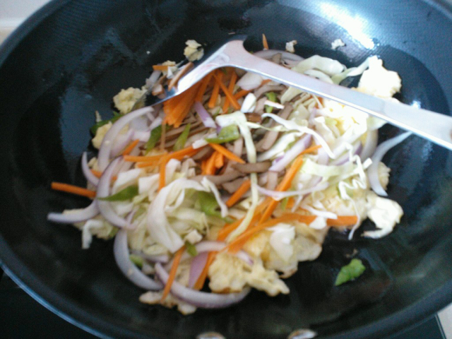 5. 雞蛋煎好,把蔬菜絲倒入,大火翻炒。加一小勺雞精、白糖、少許辣椒面,翻炒入味放適量清水。