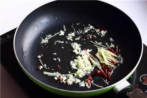 6、炒鍋燒熱,放入一植物油,冷油放入干辣椒,姜絲,蒜蓉炒出香味。