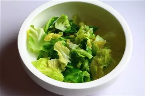3、撈起白菜用涼水沖涼,放入冰開水中浸泡約2分鐘,將圓徹底瀝干水份,放入碗內(nèi)。(口感更脆爽