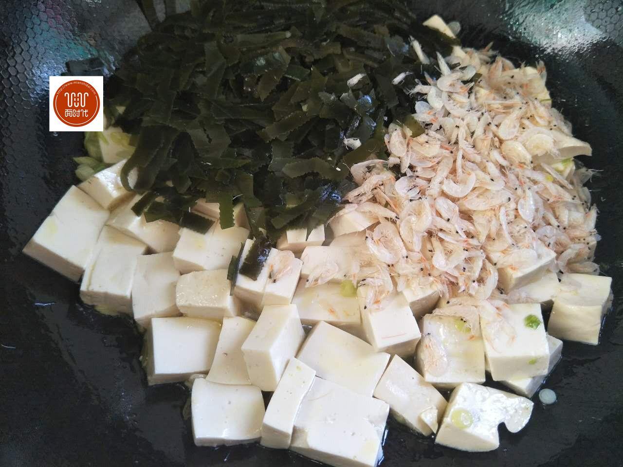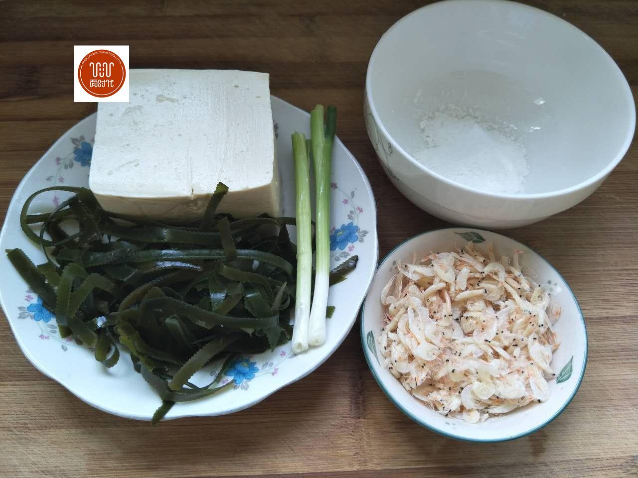 食材:豆腐1塊、海帶、蝦米適量、干淀粉1勺、蔥2段,鹽適量。