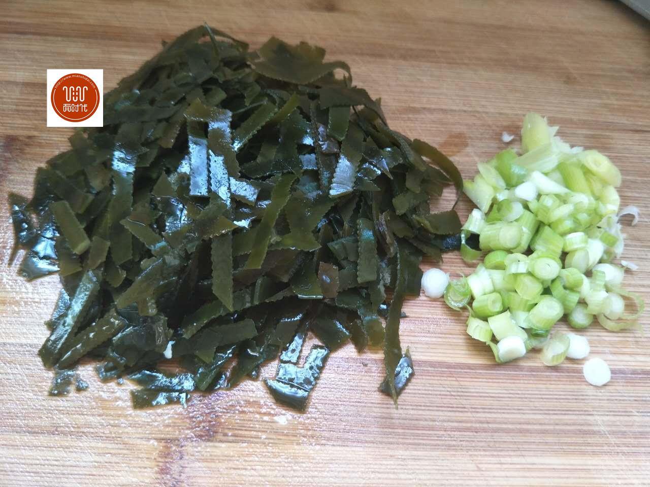 3、將泡好的海帶洗凈,切成小段,蔥段切碎。