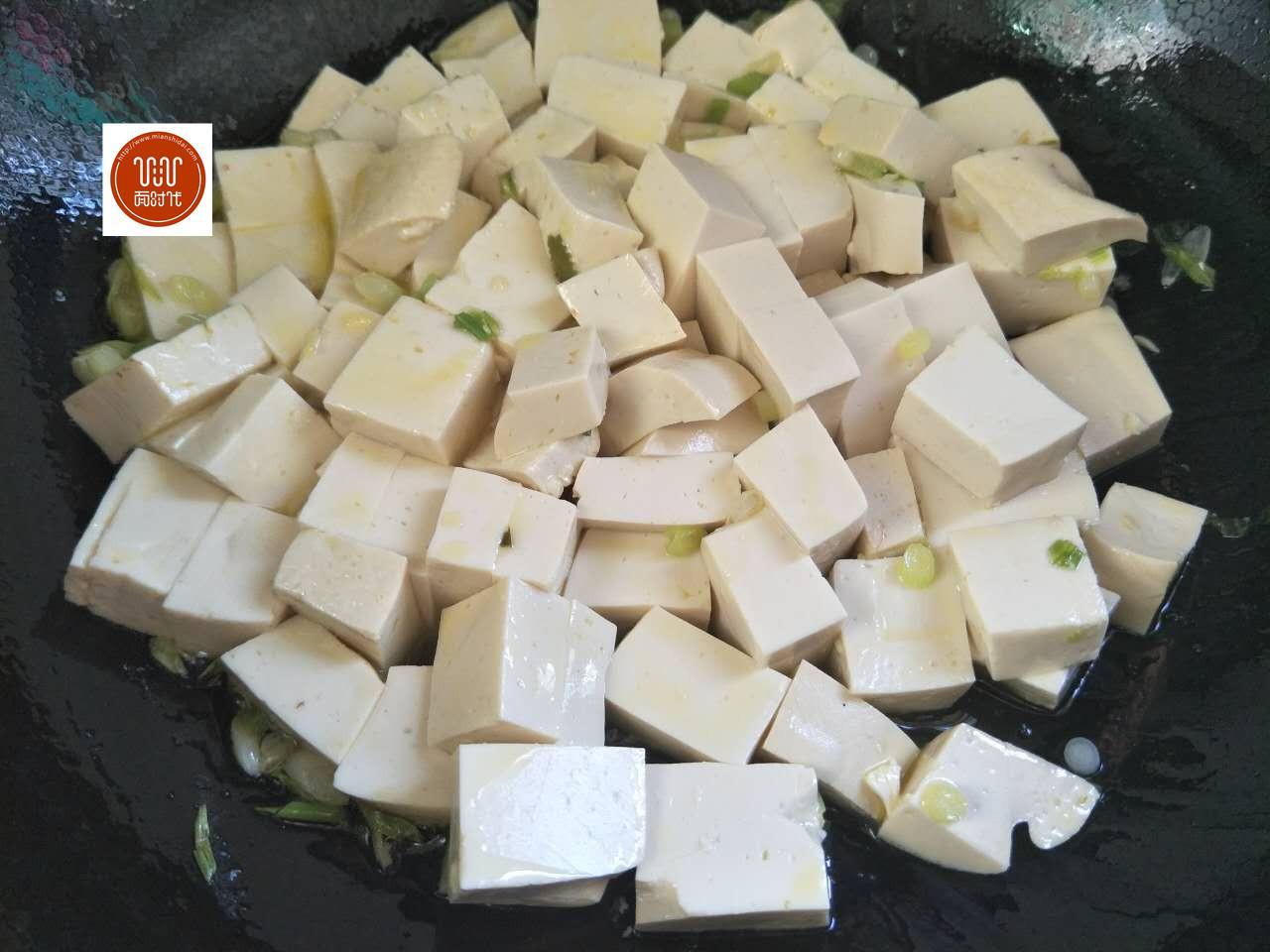 5、鍋中加入適量色拉油,放入 小蔥爆香 ,放入豆腐翻炒一下。