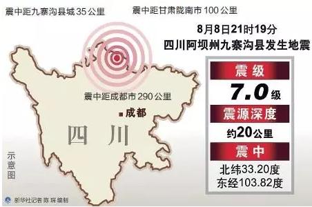 8月8日21時19分在四川阿壩州九寨溝縣(北緯33.20度,東經(jīng)103.82度)發(fā)生7.0級地震,震源深度20千米。震中距九寨溝縣39公里、距松潘縣66公里、距舟曲縣83公里、距若爾蓋縣90公里,距隴南市105公里,距成都市285公里。