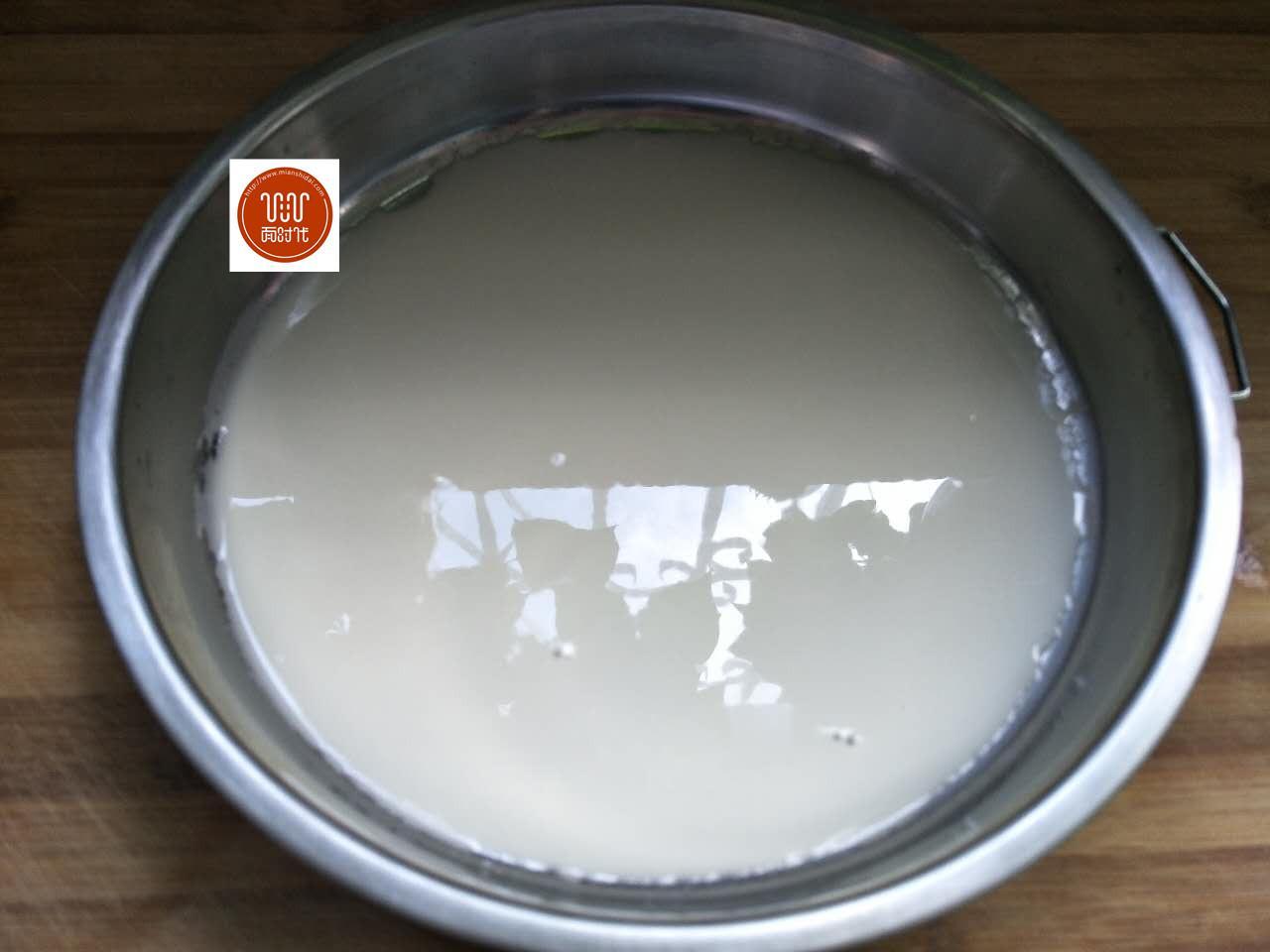 9、準備一盆冷水,把鑼鑼放入涼透,取出撕下涼皮,最好準備兩個鑼鑼,交替使用省時省力。