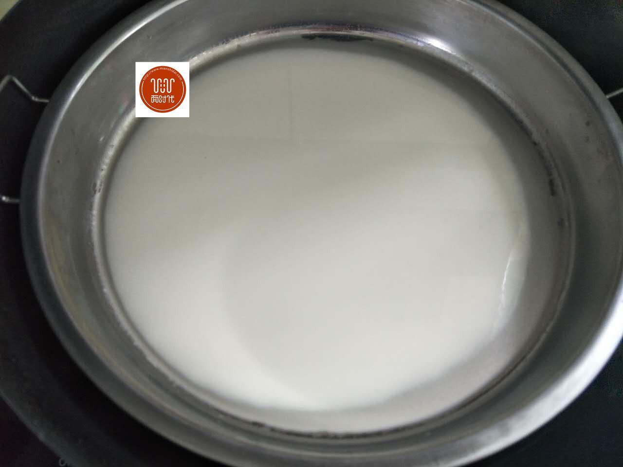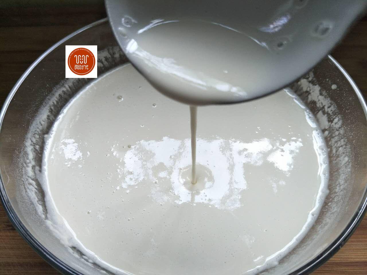 6、開始蒸涼皮,涼皮鑼刷一層薄油,舀一勺面漿,倒入涼皮鑼,(喜歡吃薄一點的可以少加一些面水,喜歡厚一點的多加一點,根據(jù)自己的口味選擇)。