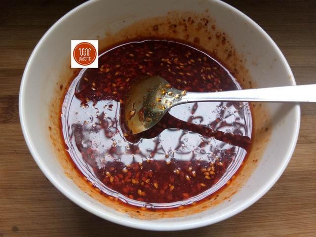 5、因家人口味不同,老媽還調(diào)了另外一種料汁,黃瓜絲切 ,綠豆芽焯水,大蒜姜砸成泥,加芝麻,辣椒面,鍋里燒適量油潑在上面,然后加鹽,醋,生抽,攪拌均勻。