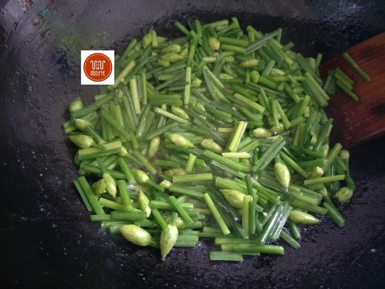 3、準備配菜,韭薹切小段,只用油炒炒,拌涼皮味道也是很好的。