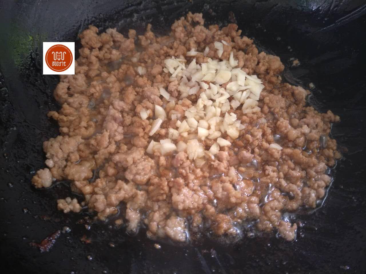 7、炒鍋中倒一點(diǎn)點(diǎn)油,直接將肉餡倒鍋中劃散,出油后倒1勺醬油,撒蒜末,炒均勻。